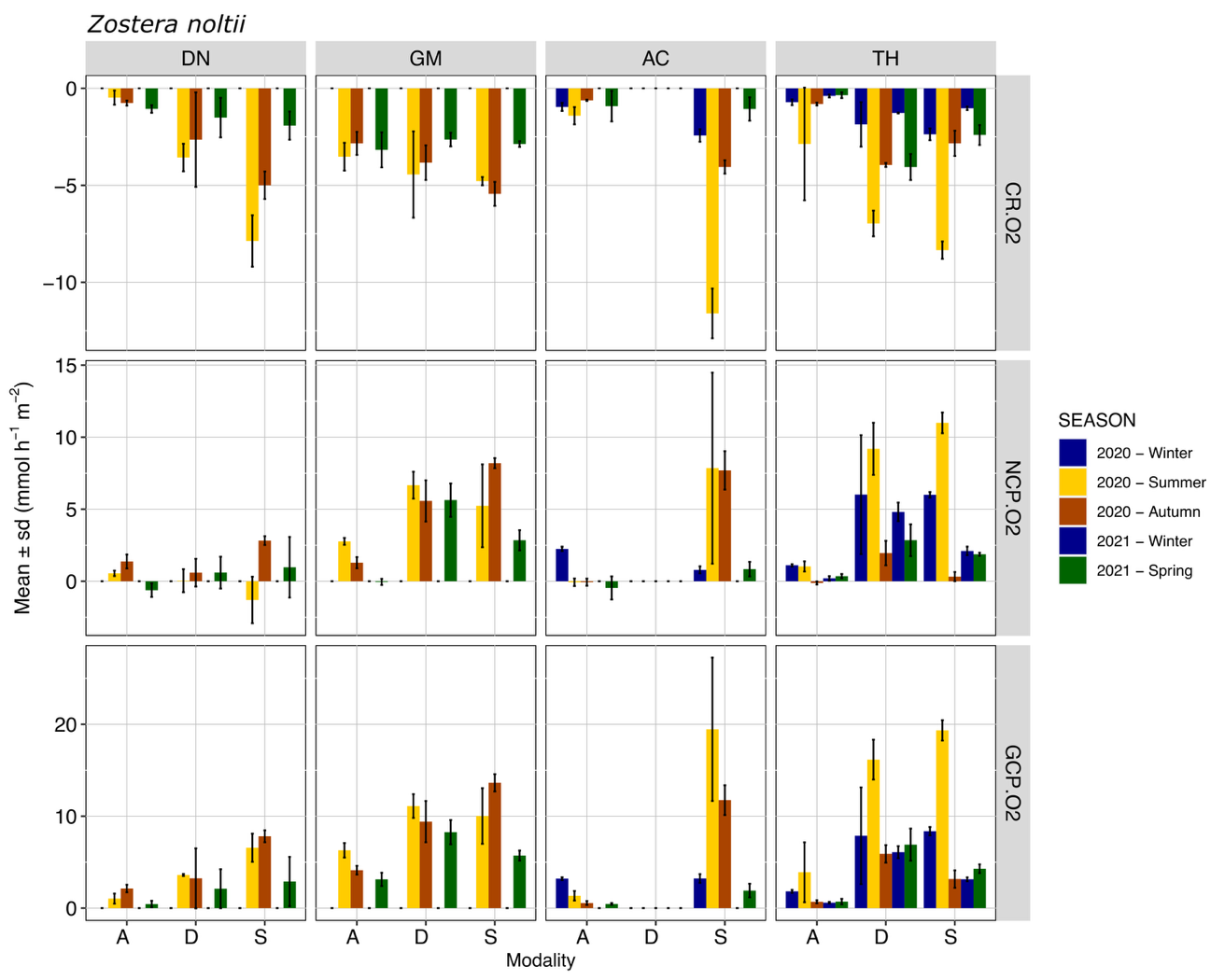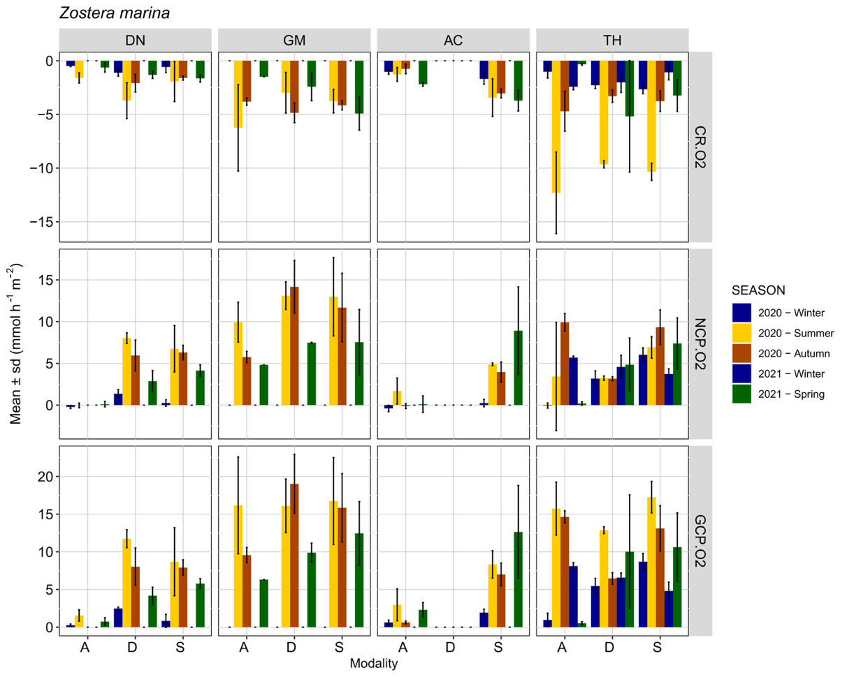 Over the last few decades, eutrophication, mechanical disturbance and climate change have been the main causes of seagrass decline worldwide (e.g. Orth et al., 2006). Some promising positive reversal trends have been observed in Europe, where management has created opportunities for recovery (Dunic et al., 2021). However, this vulnerability raises questions about the role these habitats play in both the overall functioning of coastal ecosystems, particularly with regard to carbon cycling. Empirical assessments of community metabolism are therefore essential to quantify the potential net effect of seagrass meadows of varying environmental states on carbon budgets. Accurate assessment of benthic metabolism in seagrass communities is however challenging, due to both the logistical complexity of the processes to be measured and their natural variability in time and space (Macreadie et al., 2014). Metabolism is highly mutable and dependant on a complex set of factors such as species, local biotic interactions, local hydrodynamics and associated physical characteristics, all of which vary seasonally and geographically (Ward et al., 2022). Temporal changes in seagrass morphometric traits and in associated species assemblages are also local drivers of seagrass metabolism over time (Delgard et al., 2016; Rodil et al., 2022).