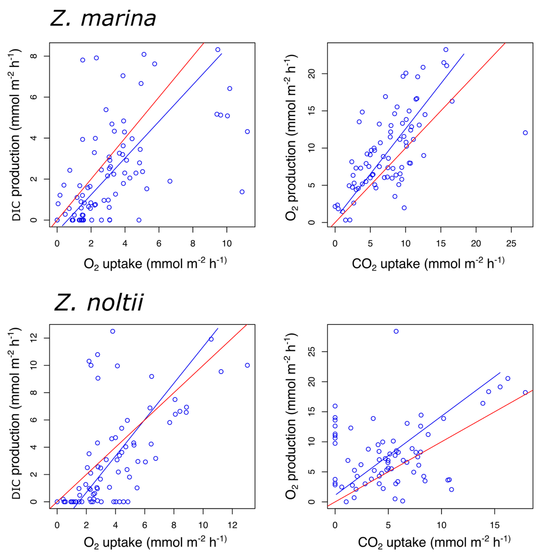 Most existing studies of metabolic processes of macrophyte communities rely on measuring O2 consumption and production rather than carbon (e.g. Hansen et al., 2000; Santos et al., 2004; Barrón et al., 2006), mainly due to the relatively straightforward measurement method of the former. The close correlation between DIC and O2 release or demand due to respiration and photosynthesis at the water-sediment interface suggests that DIC and O2 fluxes in sediments are closely coupled processes. As we are often more interested in carbon cycling, CO2 uptake and release are therefore typically derived from O2/CO2 conversion, with the community photosynthesis quotient (CPQ) and community respiration quotient (CRQ) factors set to 1 which is the theoretical value expected. However, there are challenges in using this conversion factor when autotrophic and heterotrophic organisms coexist – such as in seagrass habitats – and for which situations the CRQ values tend to deviate from 1 (Trentman et al., 2023). For example, anaerobic reduction of sulphate may underestimate respiratory losses while overestimating net production. As part of this study, we have jointly estimated O2 and DIC fluxes, providing a reliable estimate of CRQ and CPQ ratios across a large gradient of ecosystem variations spanning most of the Z. marina and Z. noltii range in Europe.