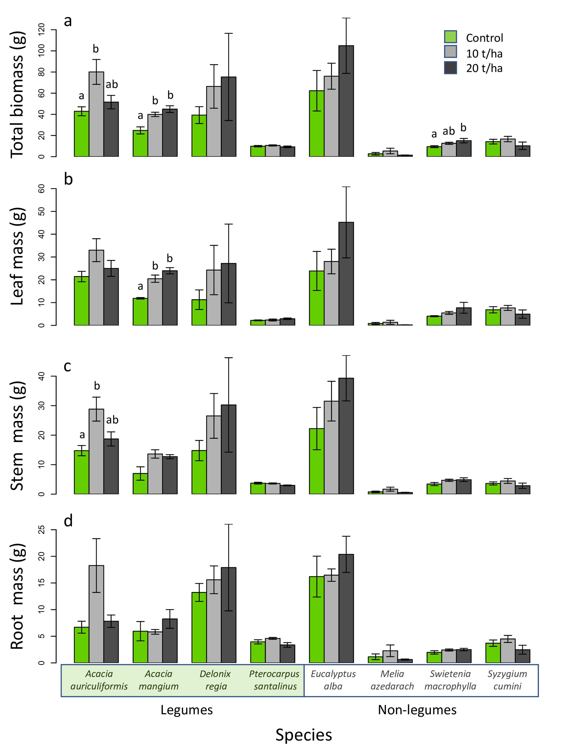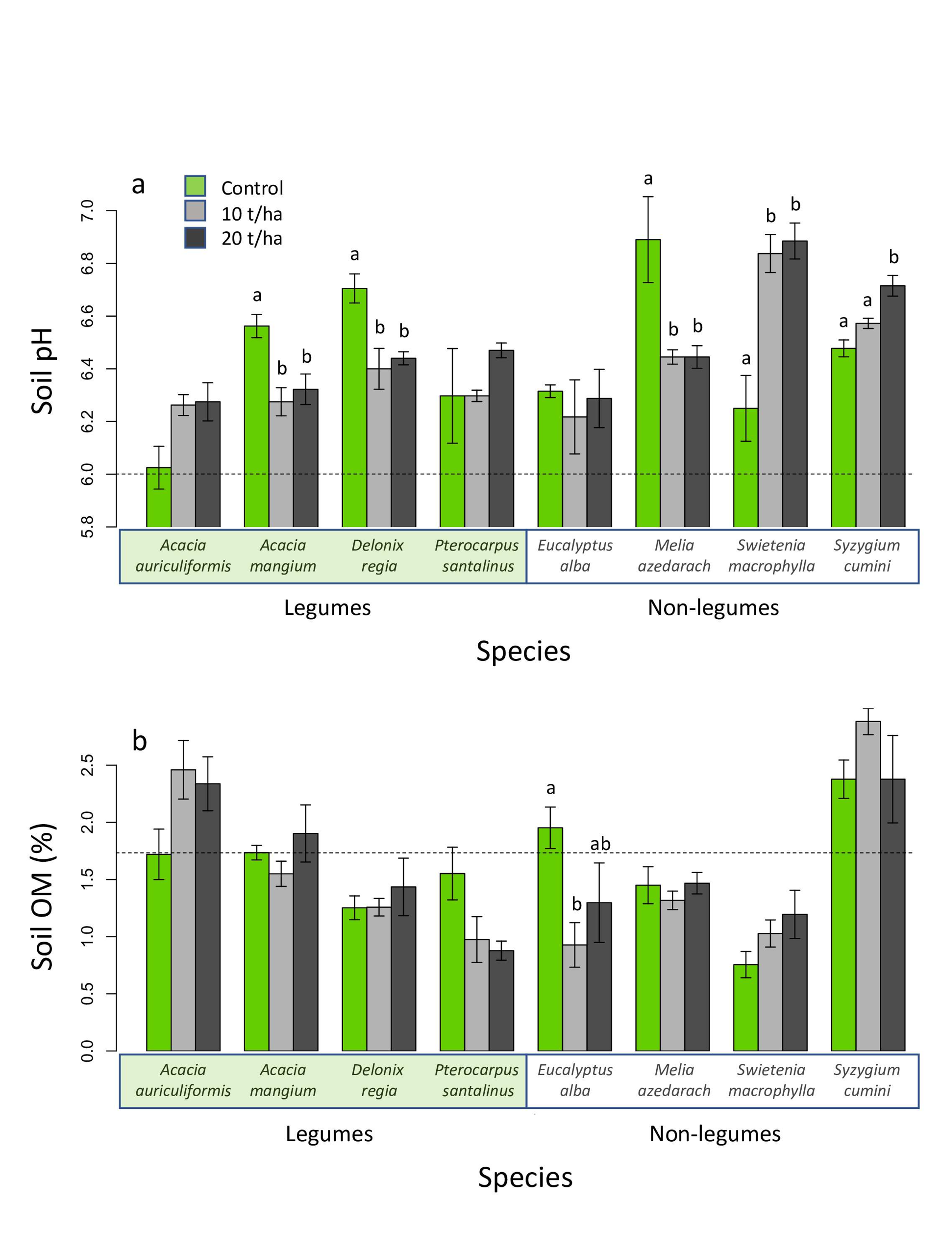 Comparative responses of legume vs. non-legume tropical trees to biochar additions