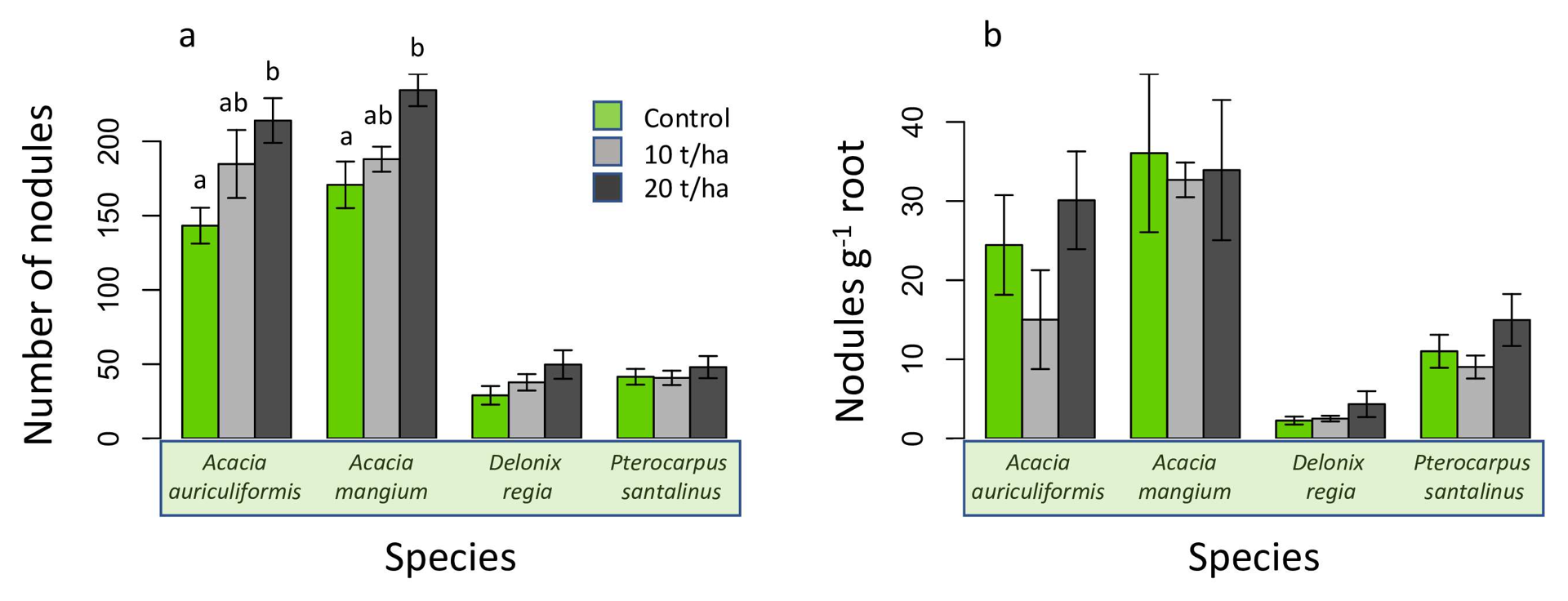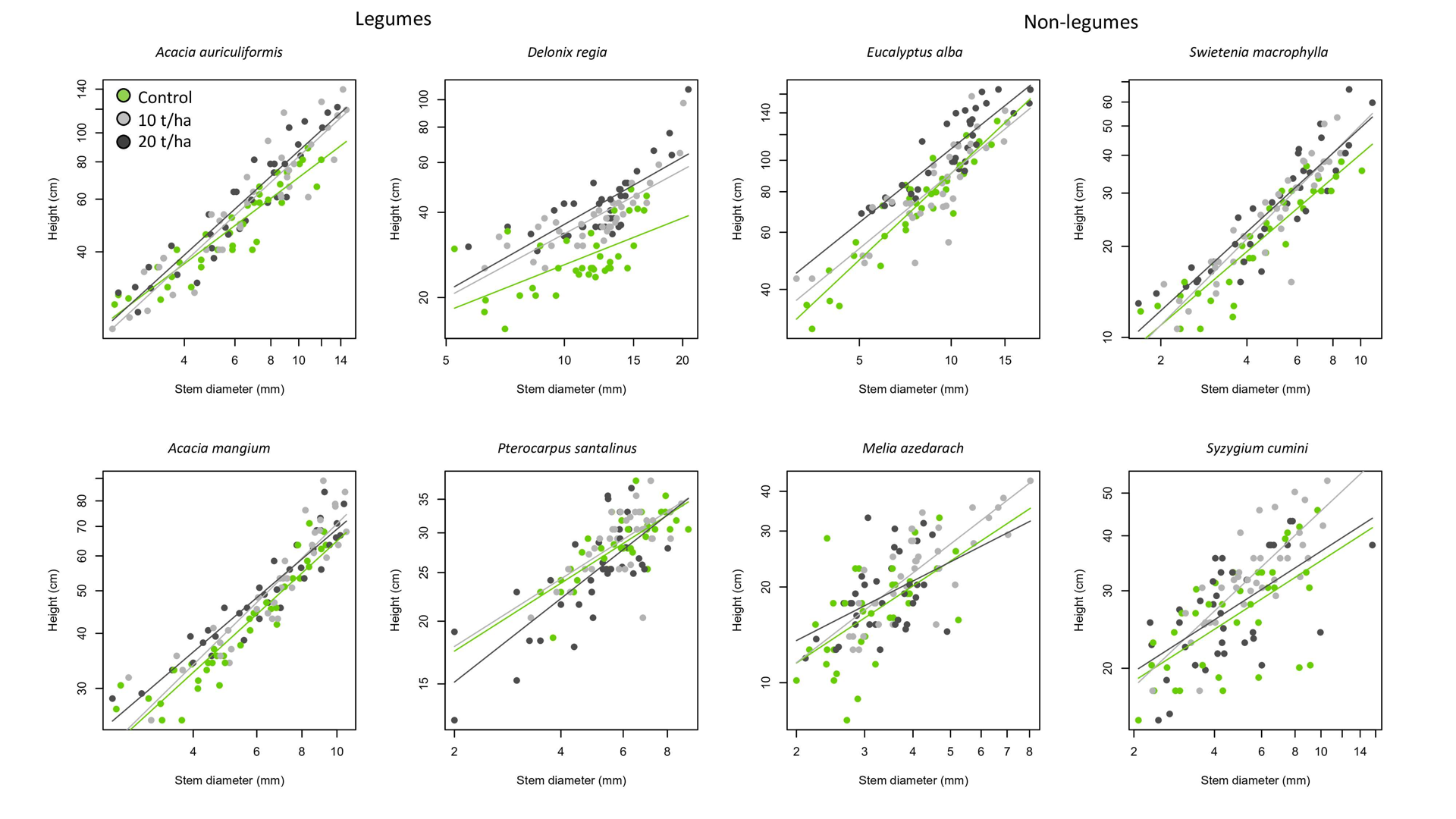 In the present study, we assessed biochar responses of tropical trees on a representative degraded soil in the Sylhet region of Bangladesh, comparing responses of four legume and four non-legume tree species. We address the following questions: (1) Does biochar enhance overall sapling performance? (2) Do legume species show greater increases in biomass and other measures of plant performance than non-legumes? (3) Are there biochar effects on allometric or morphometric patterns and do legumes differ from non-legume species in this regard? (4) Are there positive effects of biochar on root nodule production in the legume species? (5) How do results compare with those of a meta-analysis of available data on tropical tree responses?