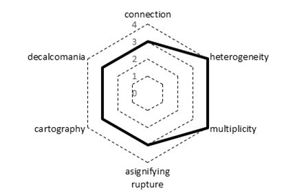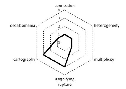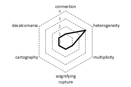 The principle of asignifying rupture, then, acknowledges the lack of hierarchical order within the rhizome, the absence of predetermined order, allowing for breaks or interruptions to happen anywhere in the rhizome. The rhizome thus contrasts with the tree or the root (Lawley, 2005), where cutting the trunk can be fatal, the rhizome is resilient, and in the event of a break, it will always resume its growth. The rupture is thus not significant for the whole, connections exist, and more connections can be made. This principle emphasizes the rhizome’s non-linear, flexible nature, where ruptures do not prevent continuity but rather encourage further development and connection.