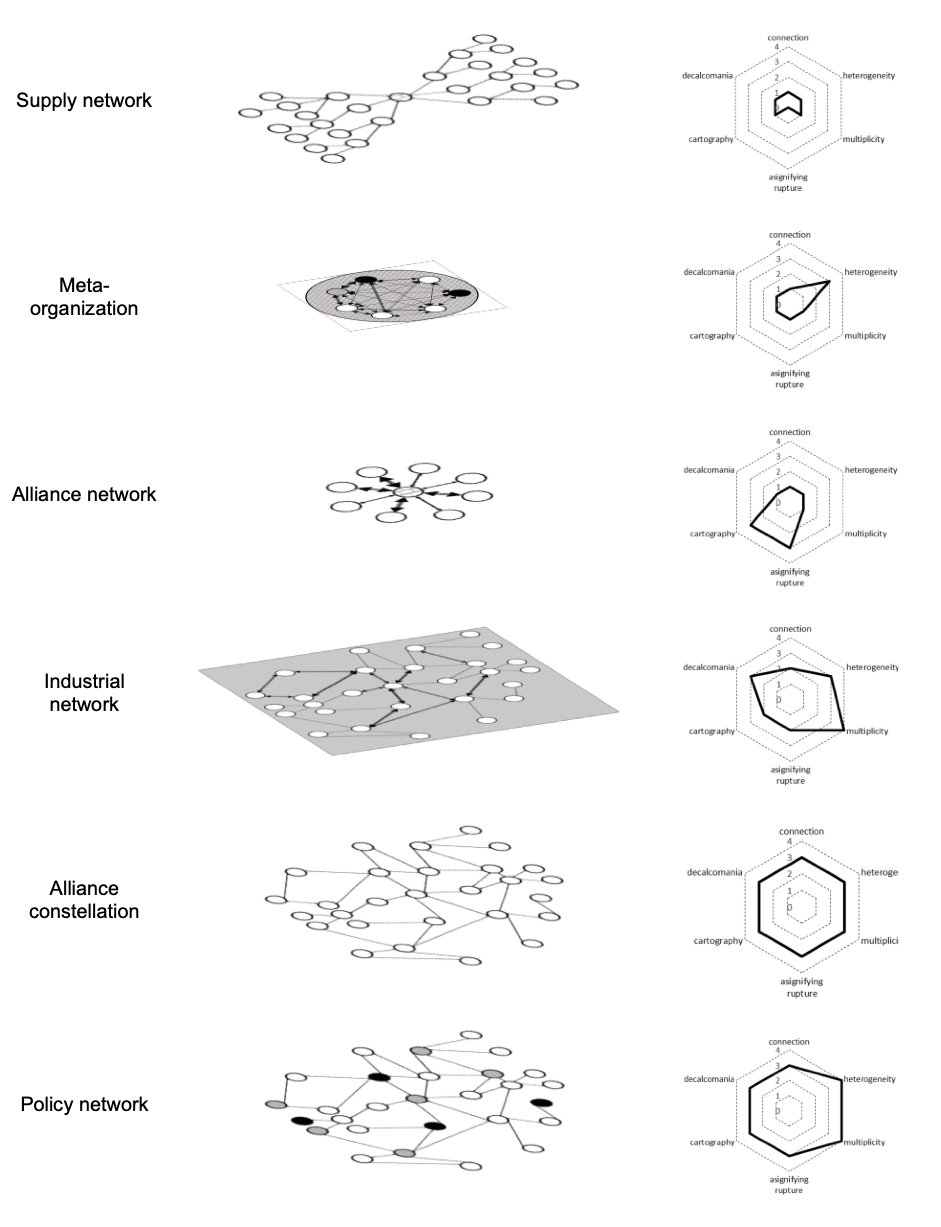 To help understand the rhizome, Deleuze and Guattari (1987) use six principles: connection, heterogeneity, multiplicity, asignifying rupture, cartography, and decalcomania. By examining these principles, we lay the groundwork for applying them beyond their philosophical origins. This foundational understanding is crucial for appreciating the rhizome’s potential to offer new insights into the dynamic and complex nature of inter-organizational arrangements.