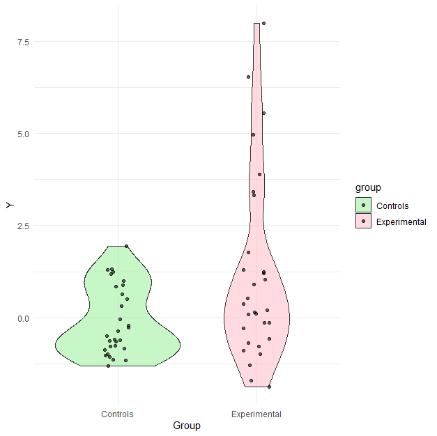 In the simulated example, the sample size and violations of the t-test and OLS regression assumptions (equivalent here) were sufficiently large for the standard tests to detect them. The Shapiro-Wilk test for Normality yielded W = 0.90, p = 0.011 in the control group and W = 0.87, p = 0.002 in the experimental group. Levene's test for homogeneity of variance yielded F(1, 58) = 6.98, p = 0.011. Figure 1 shows the distribution by group using a violin and jitter plot. Seven extreme values appear exclusively in the experimental group, strongly extending the distribution there.