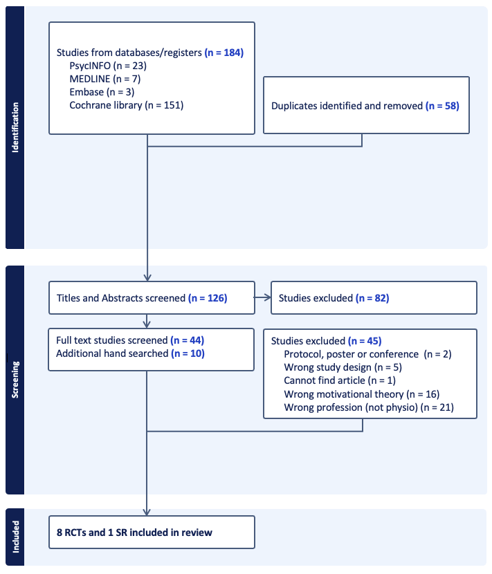 Once consensus was achieved, one reviewer (JO) completed the review of all titles and abstracts. Our inclusion criteria were SRs and RCTs published in English between 1990-2024, targeting physiotherapy services (i.e., evaluation, interventions, service delivery) or exercise interventions provided by a physiotherapist, and used SDT in the development of the interventions or assessments. Protocols and observational studies were excluded. Using the same process as above, we screened 10 full-text studies to pilot the full-text reviewing form. One reviewer (JO) completed the screening of all full texts while another reviewer (JvI) independently screened all excluded full text. Conflicts were resolved by discussion between reviewers until consensus was reached.