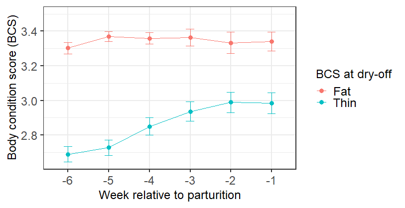 *Cows were categorized into thin (BCS at dry off ≤3) and fat (BCS at dry off >3).