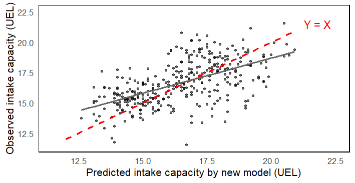 The intake capacity predicted by this new model is positively correlated to the observed value (R2 = 0.34, p < 0.001, Figure 3), with a slope of 0.58 (significantly different from 1, p < 0.001) and a RSE of 1.45. The intercept (7.11) is significantly different from 0 (p < 0.001). The mean and slope biases account for 1.2% and 21.4% of the MSPE respectively. A high proportion of the MSPE (77.4%) is attributed to random variation.