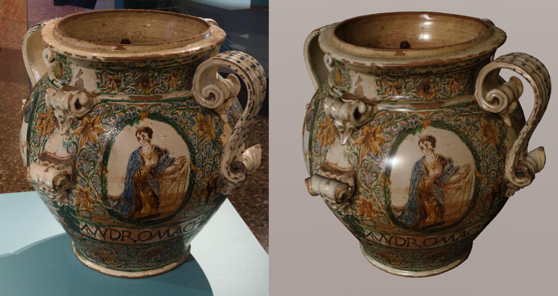Applying the process to the Teriaca Vase (Sullini, 2025) (Figure 4) enabled the creation of a lightweight and efficient 3D asset optimised for Web3D platforms. It is a late 18th-century jar, preserved at the Medieval Civic Museum in Bologna, that was used to store the antidote teriaca, which was used against snake bites. The vase was acquired by using a photogrammetric workflow using a mirrorless Sony A7 I (ISO 800, f/20, 2 sec. exposure, 60 mm focal length), mounted on a tripod. It is worth noting that the item could not be moved and was therefore acquired under the exhibition lighting setup. The manual retopology was carried out in close conjunction with the repair of the mesh, so that the reduction from millions to thousands of polygons simultaneously incorporated the critical decisions required to address gaps and inconsistent morphologies. This procedure ensured fine-grained local control over accuracy and topology, the latter conceived not merely as a rationalisation of the mesh but as a structure deliberately aligned with local geometric features, capable of preserving edges, curvatures and subtle morphological transitions that would otherwise be lost in an indiscriminate simplification