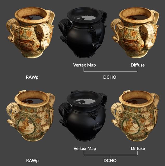 Figure 4 - Comparison between the RAWp and DCHO with vertex colour map and diffuse of the Teriaca Vase