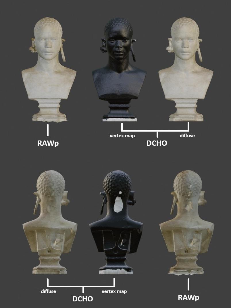 Figure 5 - Comparison between the RAWp and DCHO with vertex colour map and diffuse of the Dschagga Woman bust