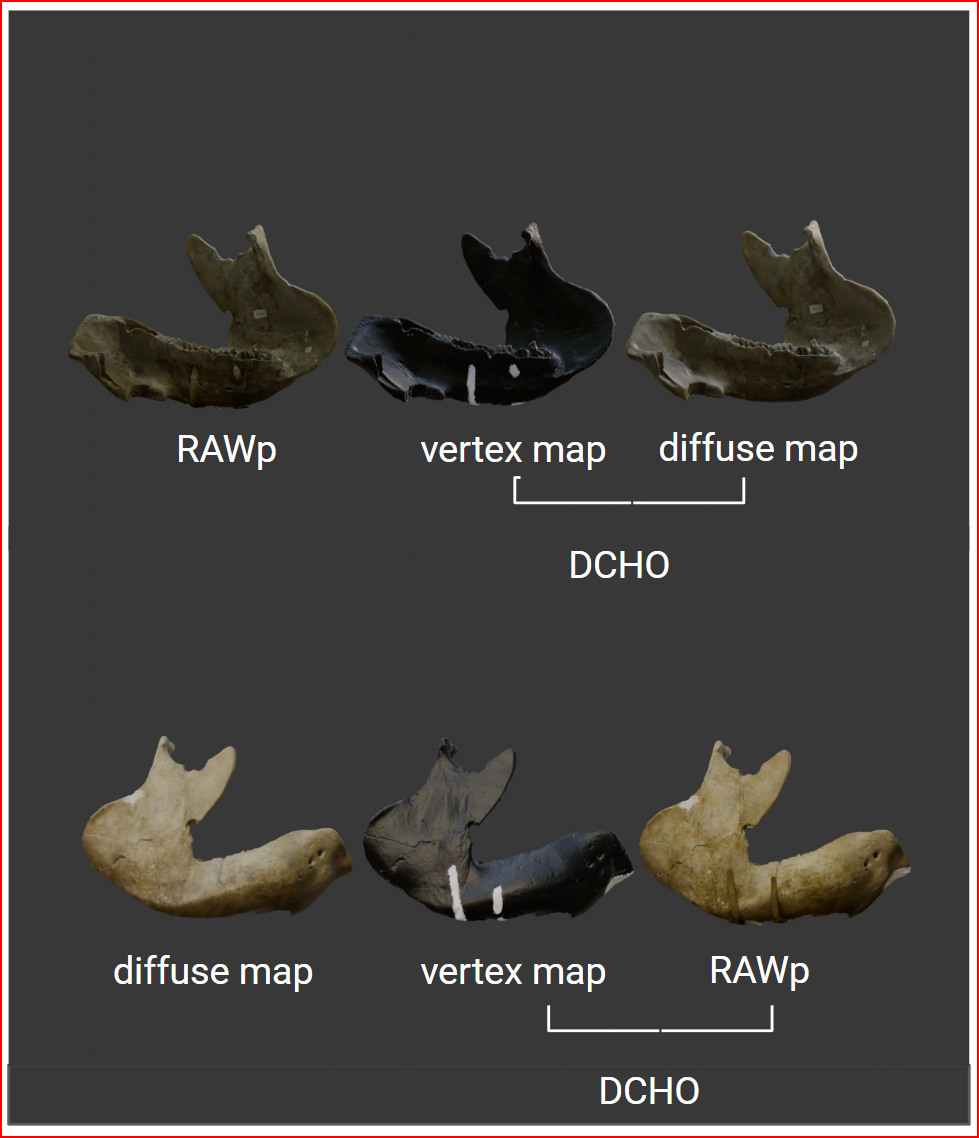 Figure 6 - Comparison between the RAWp and DCHO with vertex colour map and diffuse of the Glyptodon Jaw