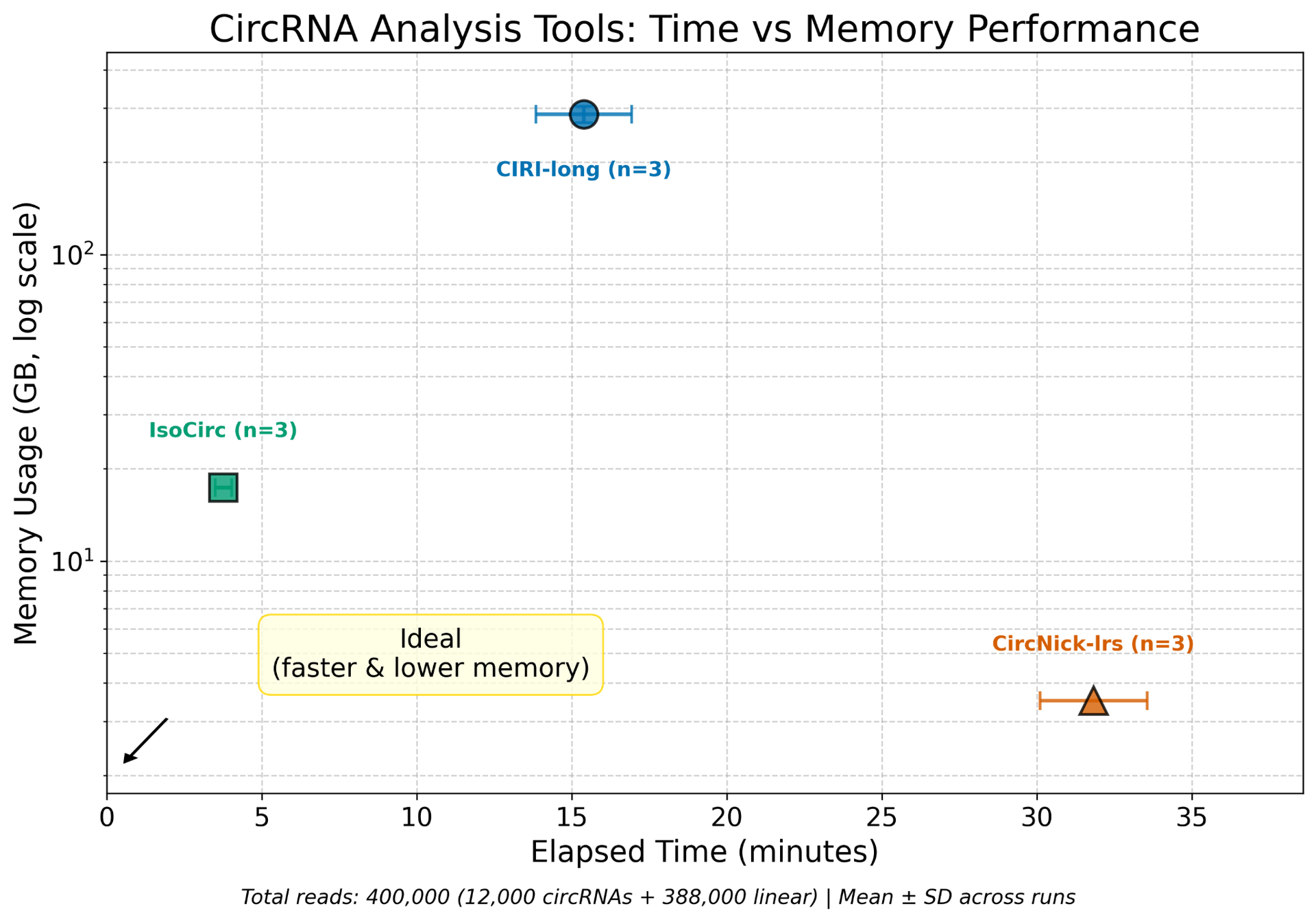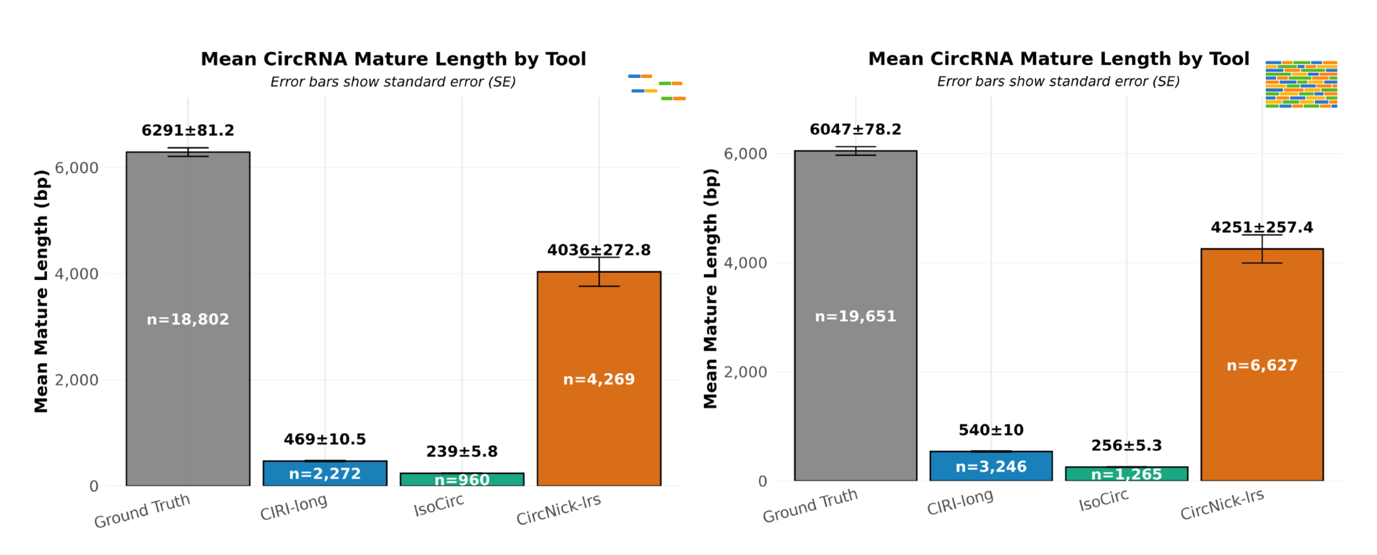 We selected these tools because they represent the three major methodological approaches to long-read circRNA detection, each with distinct experimental protocols and computational pipelines: rolling circle reverse transcription (CIRI-long), rolling circle amplification followed by nanopore sequencing (isoCirc), and direct circRNA linearization approaches (circNick-LRS). This selection provides comprehensive coverage of the current landscape of long-read circRNA detection methodologies, enabling evaluation of how different experimental and computational strategies affect detection performance across various circRNA characteristics.