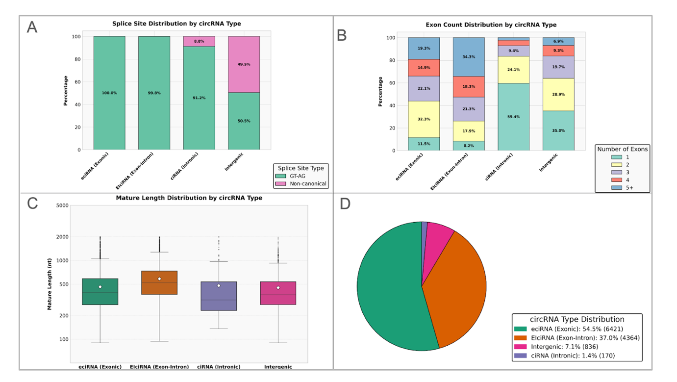 Feature extraction from databases: To understand the composition of circular RNAs, we have analysed mouse circRNAs found at an intersection between circRNA databases. We developed a computational pipeline to extract features from circRNA annotations using Python-based bioinformatics tools (pybedtools, pysam, pandas). The analysis integrated genomic coordinates, sequence information, and transcriptomic context from input BED files, reference genomes (FA), and gene annotation (GTF) files (Figure 2A). Our methodology extracted key circRNA characteristics, including genomic location (chromosome, start, end, strand), mature RNA length, and splice site details. We classified splice sites based on canonical motifs (GT-AG, GC-AG, AT-AC) and performed intersectional analysis to annotate gene and transcript types.