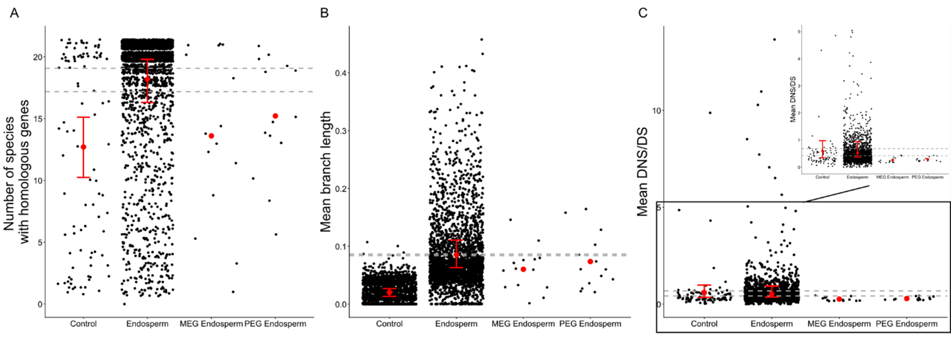 The kinship theory remains a leading explanation for the evolution of imprinted genes (Haig, 1997; Spencer & Clark, 2014; Patten et al., 2014). Imprinting is an epigenetic form of regulation in flowering plants and mammals in which allele expression depends on parental origin (Haig, 1997; Wilkins, 2011). By creating hemizygous expression of parental alleles, the kinship theory argues that imprinting evolves to resolve parental conflicts over resource allocation. Consequently, imprinted genes are expected to be disproportionately expressed in the endosperm in plants, the tissue where parental conflict operates (Haig, 1997; Haig, 2000). Thus, the proportion of Maternally Expressed Genes (MEGs) and Paternally Expressed Genes (PEGs) upregulated in the endosperm should exceed the genome-wide expectation derived from sampling all expressed genes. According to this hypothesis, many imprinted genes appear to be involved in resource accumulation in the endosperm and metabolic processes (Raissig et al., 2011). These theoretical expectations and previous empirical observations justify testing whether MEGs and PEGs are disproportionately upregulated in endosperm relative to random expectation.