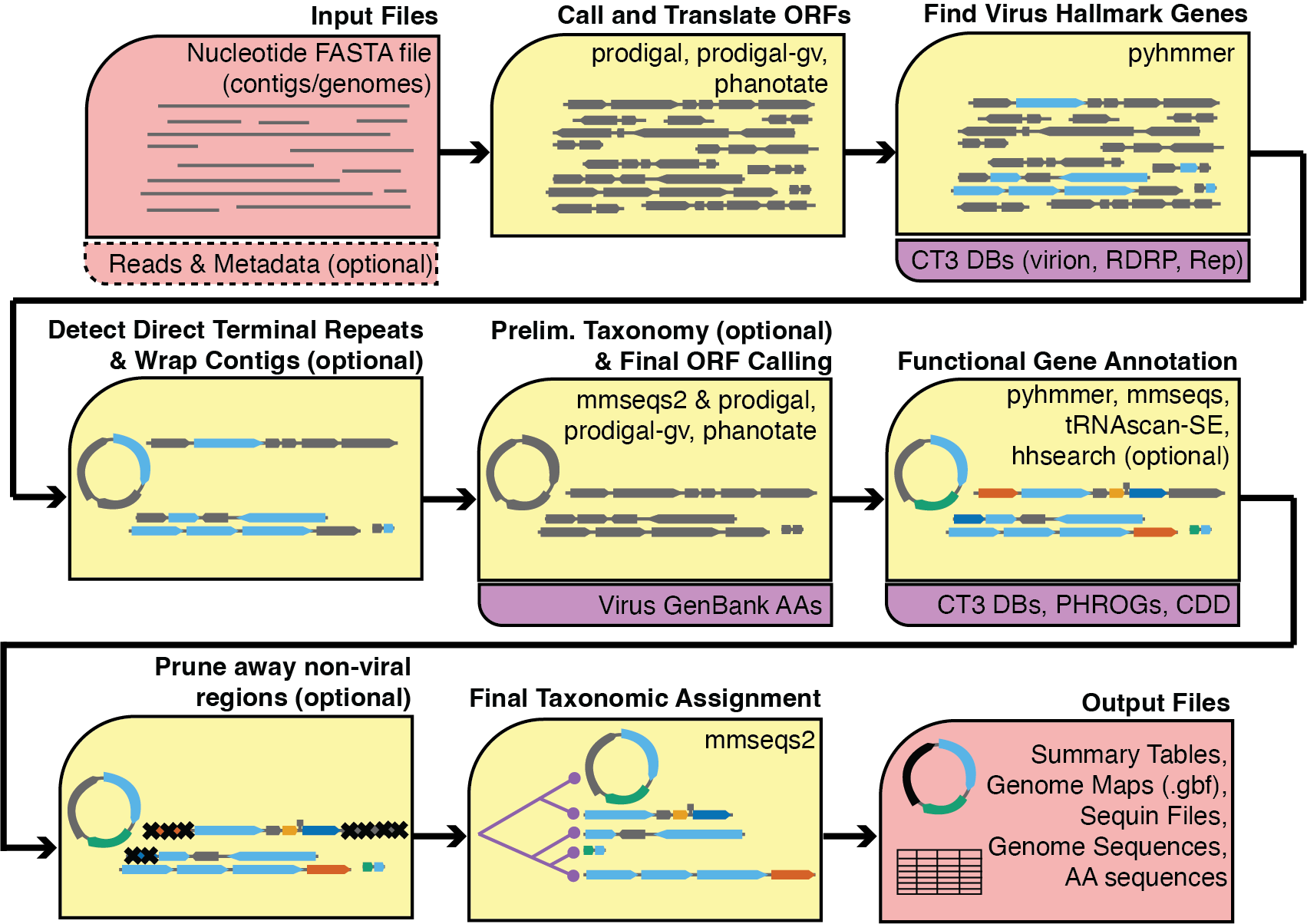 Figure 1 - Cenote-Taker 3 Schematic. A visual description of how input contigs are systematically processed by Cenote-Taker 3 to identify virus genomes, produce gene annotations, prune prophages, and assign taxonomy. Output files include genome maps (.gbf), tabular virus- and gene-level summaries, and sequences (.fasta).