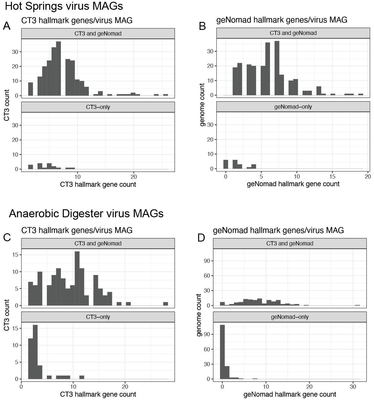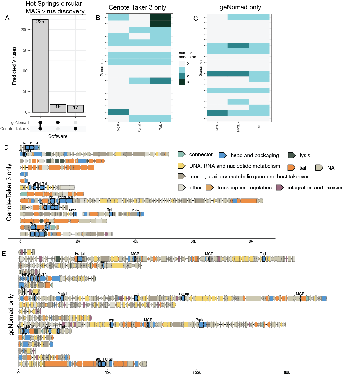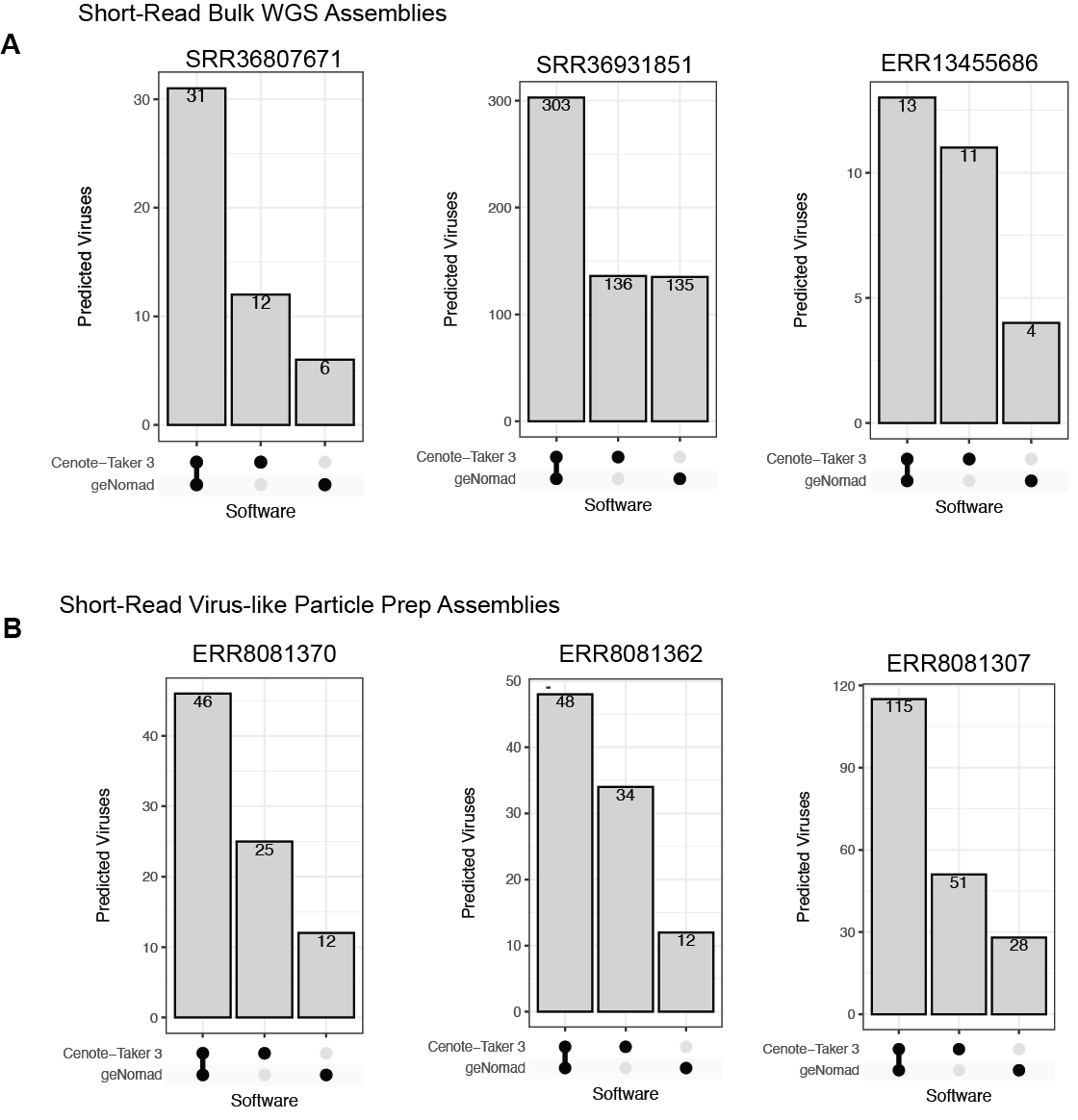 GeNomad end-to-end pipeline was run on these data with default settings plus the “—enable-score-calibration” flag. Cenote-Taker 3 was run with the flags “-p T—lin_minimum_hallmark_genes 2 --circ_minimum_hallmark_genes 2” as recommended on the GitHub README for whole genome shotgun metagenome data.
