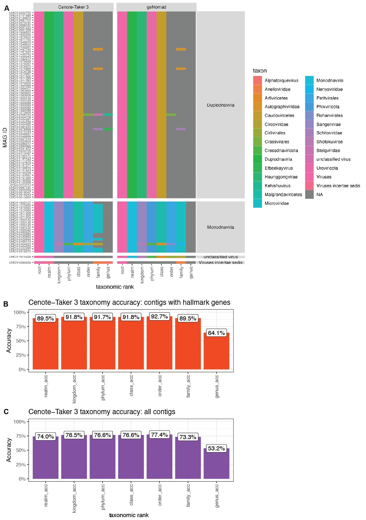 Cenote-Taker 3 also assigns hierarchical taxonomy of virus contigs based on identity of its “hallmark” genes to GenBank virus records. A comparison of the aforementioned UHGV dataset of 100 high-quality MAGs shows very similar output to geNomad (Figure 12A). Next, thousands of random GenBank genomes with NCBI taxonomy labels were downloaded, and Cenote-Taker 3 was used to annotate these to determine taxonomical concordance. For genomes where Cenote-Taker 3 detects a marker gene, we see >89% agreement with GenBank down to the family level (Figure 12B). Cenote-Taker 3 will only classify genomes for which a hallmark gene is detected. When considering all contigs from this set, the accuracy drops to 73% at the family level (Figure 12C), mostly due to the many reverse-transcribing viruses in GenBank, which Cenote-Taker 3 DB does not contain hallmark genes for, and small segments of segmented viruses.