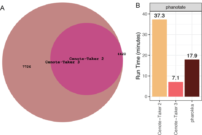 Figure 2 - Updates from Cenote-Taker 2. (A) The hallmark gene Hidden Markov Model database from Cenote-Taker 2 was expanded for Cenote-Taker 3 by adding 7,726 new models. (B) Comparing time to process 100 UHGV genomes between Cenote-Taker 2, Cenote-Taker 3, and Pharokka. The phanotate open reading frame predictor was used as it is the only setting that is comparable to Cenote-Taker 3.