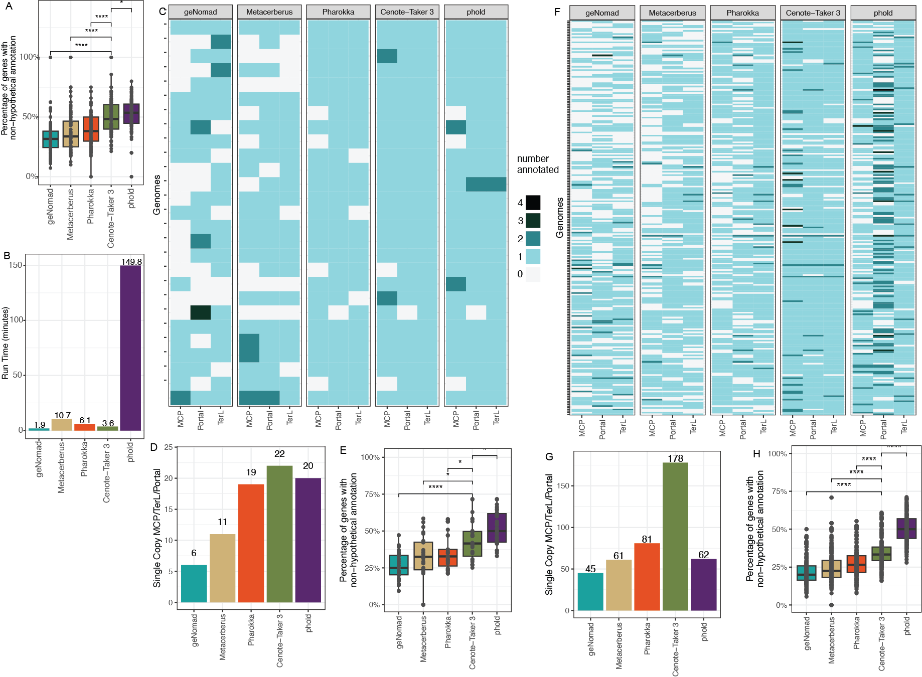 Figure 3 - Virus gene annotation benchmarks. (A) UHGV 100 virus Metagenome-Assembled Genomes (MAGs) annotated with five different software packages. The y-axis reports annotated (non-hypothetical) genes as a percentage of total genes. (B) Wall time for UHGV 100 virus MAGs annotation. (C) 27 circular gut (stool)-derived head-tail phage MAGs annotated by five software packages. Per-genome number of annotated major capsid protein (MCP), large terminase subunit (TerL), and portal protein genes. (D) Out of 27 circular gut (stool)-derived head-tail phage MAGs, number of genomes with single copy MCP/TerL/portal genes. (E) 27 circular gut (stool) head-tail phage MAGs, reporting annotated (non-hypothetical) genes as a percentage of total genes. (F) Like (C) but with 242 seawater-derived head-tail phage MAGs. (G) Like (D) but with 242 seawater-derived head-tail phage MAGs. (H) Like (E) but with 242 seawater-derived head-tail phage MAGs.