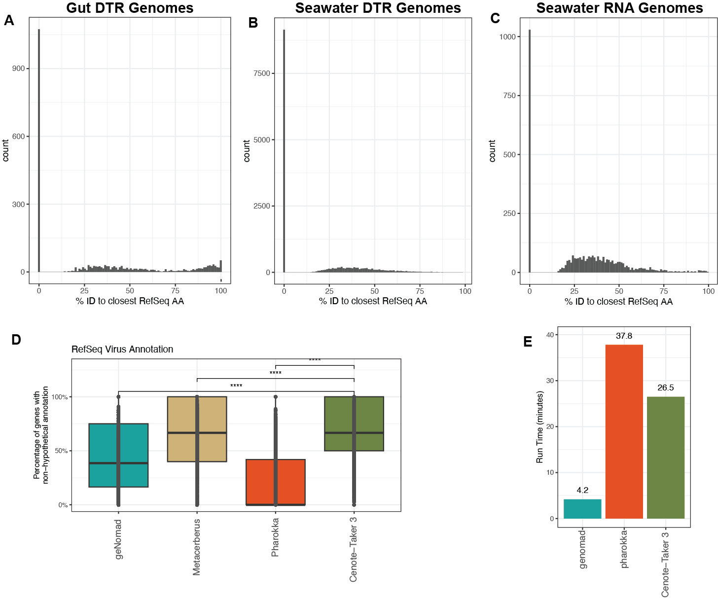 Figure 4 - Additional Annotation Analyses. Translated amino acid sequences were compared to RefSeq Virus amino acid sequences using mmseqs (e-value cutoff 0.01) for (A) Gut DTR Genomes, (B) Seawater DTR Genomes, and (C) Seawater RNA Genomes. (D) RefSeq Virus genomes (n=18,969 contigs) annotated with four different software packages. The y-axis reports annotated (non-hypothetical) genes as a percentage of total genes. (E) Wall Time for Annotating 1,000 UHGV Genomes.