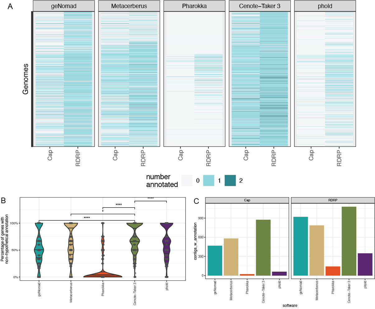 RNA viruses, such as those that might be sequenced in metatranscriptomics studies, have more diverse genome end types and may consist of multiple segments. Therefore, determining completeness of previously undiscovered viruses is more difficult. Nevertheless, other, potentially more biased, methods exist to detect complete virus MAGs. Here, MAGs from an RNA sequencing dataset from a large seawater virus-like particle preparation (Table 1) were filtered using CheckV to retain putatively complete and high-quality virus genomes (Figure 4C). These genomes were annotated by the same five software packages, and Cenote-Taker 3 had the highest proportion of annotated genes and had the highest number of contigs with an annotated RNA-dependent RNA polymerase (RdRP) gene and Capsid/Coat gene (Figure 5). It should be noted that Pharokka and phold are designed for DNA phages, and their decreased performance should be understood as a design choice.