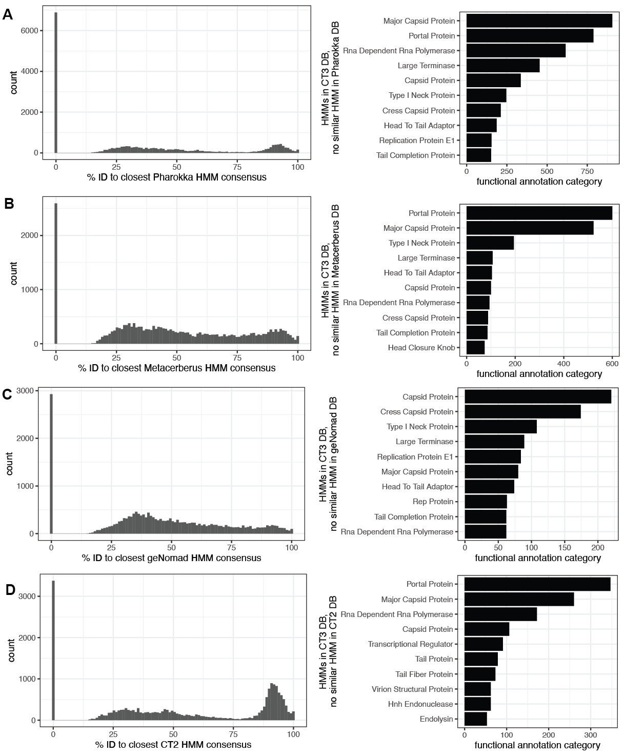 Figure 6 - Comparison of Gene Family HMMs. Consensus sequences from all individual HMMs were extracted from Cenote-Taker 3, Pharokka, MetaCerberus, geNomad and Cenote-Taker 2 and compared with mmseqs2. (A) Left: histogram of amino acid identity of consensus sequences of Cenote-Taker 3 DB to Pharokka DB. Right: top 10 functional categories of Cenote-Taker 3 models with no detected similar to Pharokka models. (B) Like A but with MetaCerberus and Cenote-Taker 3. (C) Like A but with geNomad and Cenote-Taker 3. (D) Like A but with Cenote-Taker 2 and Cenote-Taker 3.