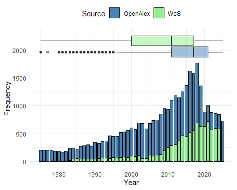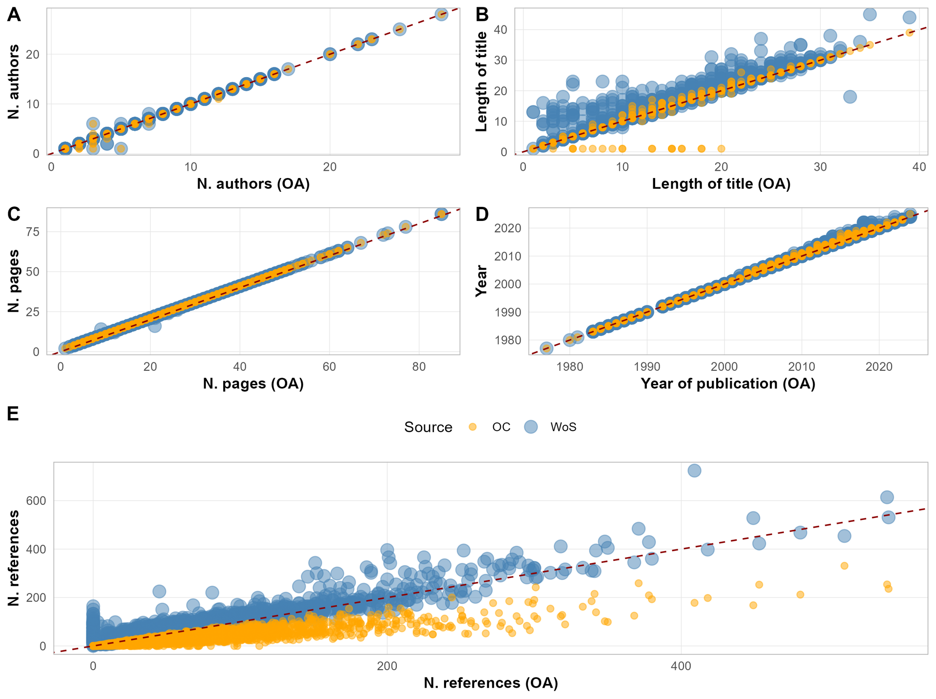 The basic metadata for articles present in both datasets are highly consistent, with one notable exception: OpenAlex excludes subtitles when calculating title length, whereas WoS includes them. The other key difference lies in the reference lists for each article, a particularly challenging dataset to compile in an open-source, non-commercial project, given that private companies have curated and monetized this data for decades. OpenAlex constructs its own metadata for cited references, which introduces certain issues. For example, journals sometimes cross-reference all articles in a given volume because each PDF includes the volume’s full table of contents with DOIs. Additionally, between versions 3 and 4 of this manuscript, thousands of references were incorrectly attributed to a Japanese database.