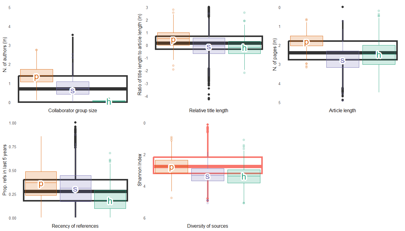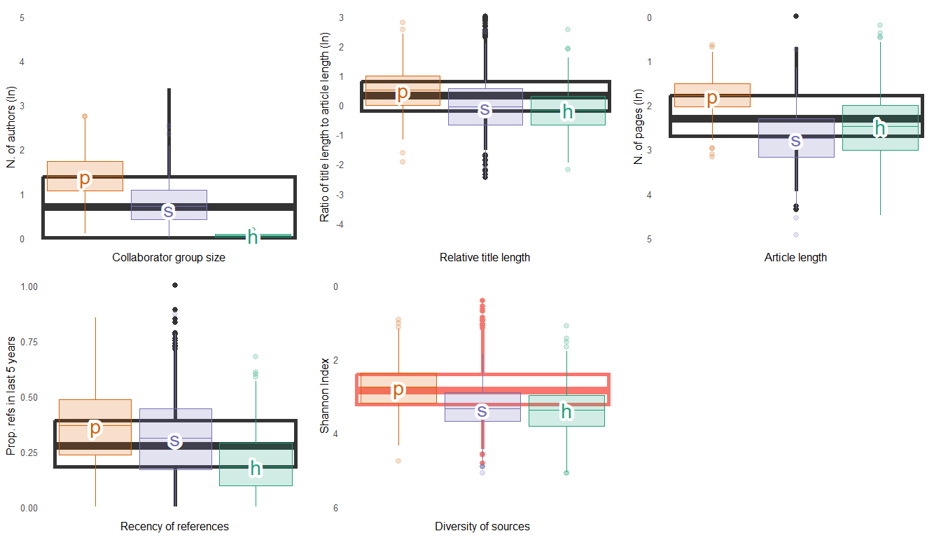 Figure 4 - Replication of the figure 1 of Marwick (2025) for 2012 articles only as in Fanelli and Glanzel (2013), based on OpenAlex data. Distributions of article characteristics hypothesised to reflect the level of consensus. The color is red for Diversity of source because I suspect this value to be largely underevaluated due to lack of references metadata. The thick line in the middle of the boxplot is the median value, the box represents the inter-quartile range (the range between the 25th and 75th percentiles, where 50% of the data are located), and individual points represent outliers. The smaller coloured boxplots indicate the values computed by Fanelli and Glanzel (2013), where p = physics, s = social sciences, h = humanities. ln denotes the natural logarithm, or logarithm to the base e.