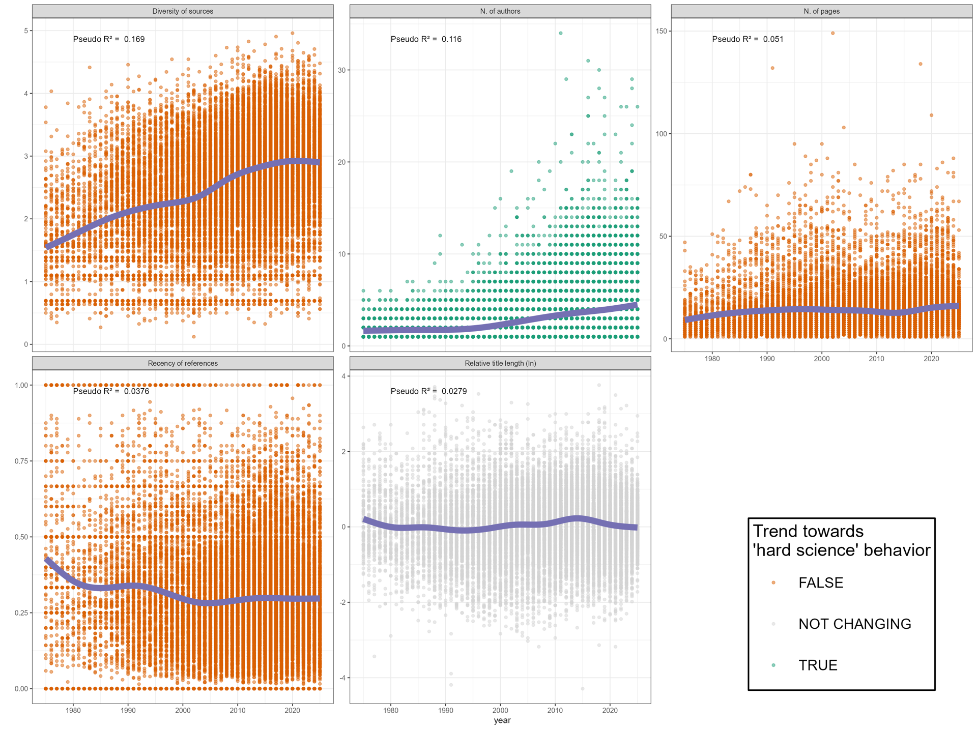 Figure 5 - Replication of the figure 2 of Marwick (2025) with OpenAlex data. Distribution of article characteristics for archaeology articles over time. Data points represent individual articles. The colour of the points indicates if the overall trend is toward softer (orange), harder (green) or do not really change (grey).