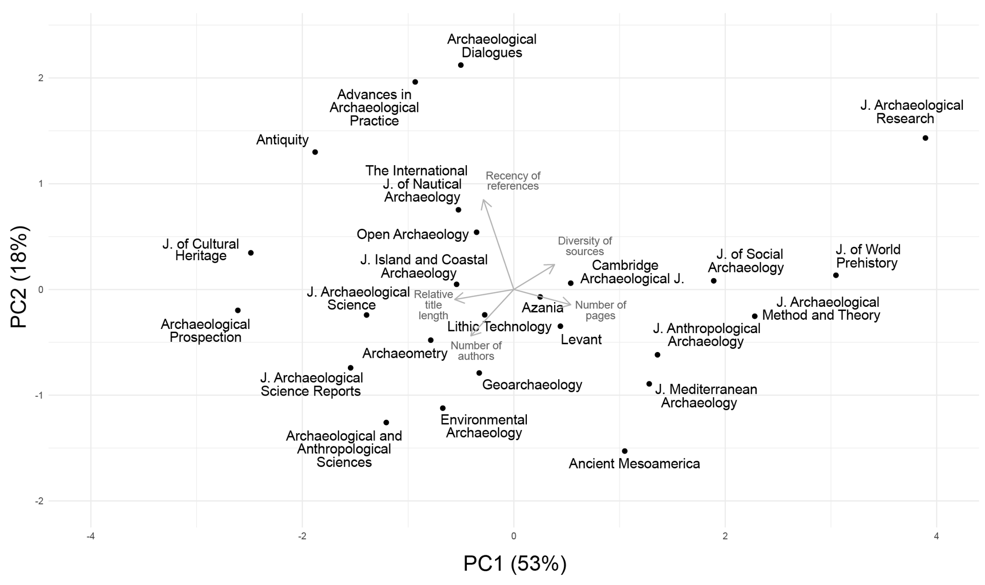 Figure 6 is the equivalent to figure 4 of Marwick (2025) and represents the characteristics of the journals in the top 25 by 2-years-mean-citedness of OpenAlex. However, it is noteworthy to remind that the journals are not all the same in both figures. The review journal Journal of Archaeological Research stands out significantly from the other journals, featuring a high diversity of sources and notably long papers. In the same direction on PC1 but in the opposite direction on PC2, Journal of Archaeological Methods and Theory, Journal of World Prehistory, and Journal of Social Archaeology are characterized by long articles with fewer authors, and references which are less diverse and less recent. Another part of the PCA is represented by a behavior more like hard science articles, with recent references, more authors and shorter papers. This group includes Archaeological Dialogues (for which many papers are short comments or answers), Advances in Archaeological Practice, and Antiquity. Large teams of authors, publishing rather short articles, and citing less diverse sources are typically what is published in Journal of Archaeological Science: Reports, Archaeological and Anthropological Science, Archaeological Prospections. The landscape of journals dedicated to archeological research is well established, with specific outputs dedicated to specific types of articles.