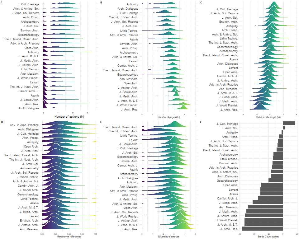 • Figure 7B-E show rankings in the length of articles, the relative length of articles and in the recency of references quite similar to the ones calculated by Marwick (2025). The journal which is ranked in the most different way between both datasets is probably The Journal of Island and Coastal Archaeology.